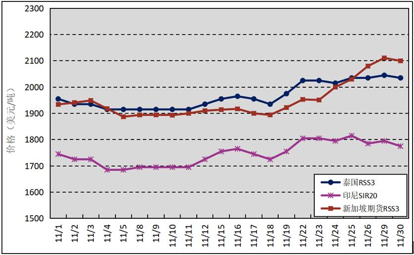 國(guó)外主產(chǎn)區(qū):11月,泰國(guó)RSS3平均價(jià)格為1966美元/噸,環(huán)比上漲42美元/噸,最高價(jià)為2045美元/噸,最低價(jià)為1915美元/噸;印尼SIR20平均價(jià)格為1745美元/噸,環(huán)比下降20美元/噸,最高價(jià)為1815美元/噸,最低價(jià)為1685美元/噸;新加坡RSS3期貨主力合約月均結(jié)算價(jià)格為1950美元/噸,環(huán)比上漲34美元/噸,最高價(jià)為2111美元/噸,最低價(jià)為1887美元/噸。