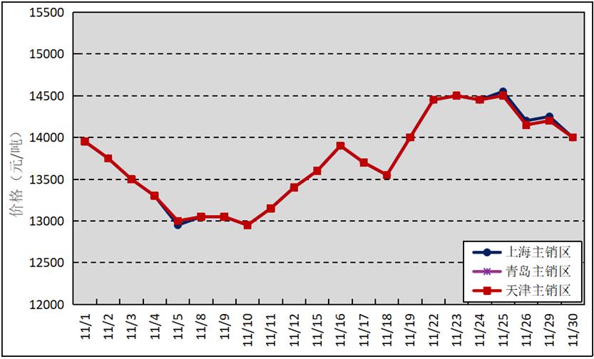 圖3 2021年11月國(guó)內(nèi)主銷區(qū)天然橡膠價(jià)格走勢(shì)