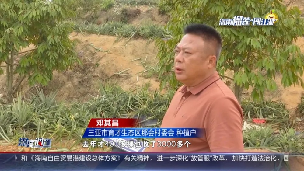 三亞市育才生態(tài)區(qū)那會(huì)村委會(huì) 種植戶 鄧其昌:去年才400棵也收了3000多個(gè),我賣60塊一斤批發(fā)給人家45一斤,后面還不夠貨賣,因?yàn)樗庀?、厚?/span>