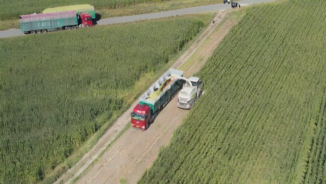 在青貯玉米采收現(xiàn)場,大型收割機在田間來回穿梭,一株株玉米連莖帶穗卷入機器,運輸車緊隨其后,將打碎的秸稈裝進車廂,空氣中彌漫著淡淡的草香味,一塊塊農(nóng)田也被耕耘整平,一派熱火朝天的繁忙景象。