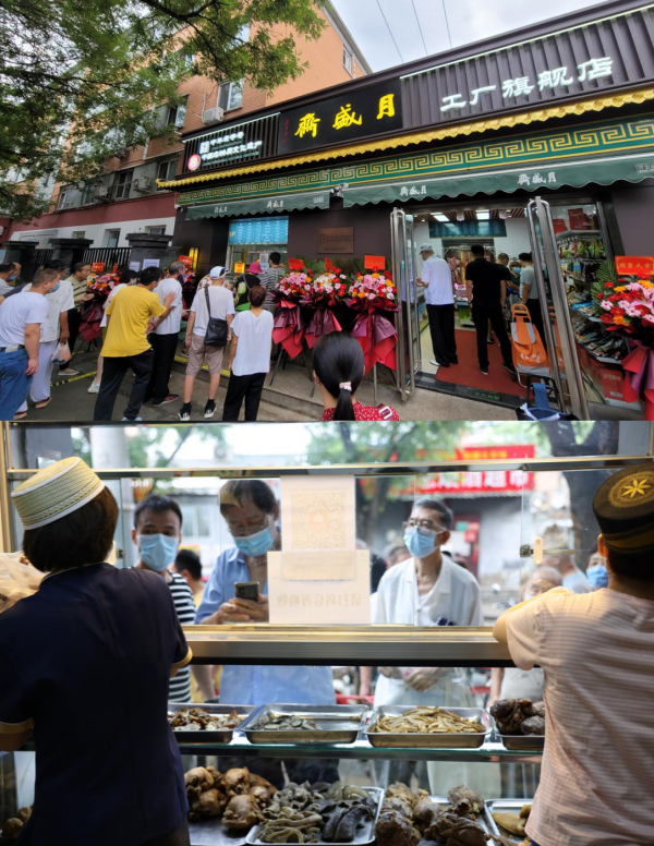 月盛齋醬燒牛羊肉制作技藝第七代傳人、北京市老字號工匠李廣瑞特地趕到門店,現(xiàn)場為消費(fèi)者制作燒羊肉以饗消費(fèi)者,聞訊而來的顧客在門店前排隊(duì)采購,吸引了一波又一波的消費(fèi)者前來捧場。