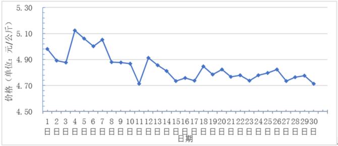 9月,全國(guó)重點(diǎn)監(jiān)測(cè)農(nóng)產(chǎn)品批發(fā)市場(chǎng)香蕉總交易量達(dá)9.1萬(wàn)噸,同比上漲8.3%,環(huán)比上漲5.8%;總交易價(jià)值 41441.1萬(wàn)元,同比上漲12.5%,環(huán)比下降1.1%。日平均價(jià)格最高為5.1元/千克,最低為4.7元/千克,全月平均價(jià)格為4.8元/千克,同比上漲2.1%,環(huán)比下降4%(每日價(jià)格變化如圖)。