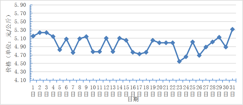 8月,全國重點(diǎn)監(jiān)測農(nóng)產(chǎn)品批發(fā)市場香蕉總交易量達(dá)2.3萬噸,同比下降32.3%,環(huán)比上漲4.5%;總交易價(jià)值11806.3萬元,同比下降43.5%,環(huán)比下降1.1%。日平均價(jià)格最高為5.3元/千克,最低為4.7元/千克,全月平均價(jià)格為 5.0元/千克,同比下降21.9%,環(huán)比下降9%(每日價(jià)格變化如圖)。