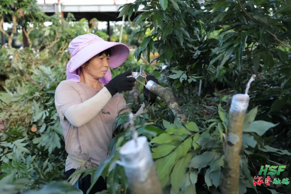 夕陽(yáng)西下,荔枝園沐浴在金色的余暉中,工人仍在園中忙碌著,一株株新嫁接的荔枝樹在微風(fēng)中輕輕搖曳,孕育新的希望。