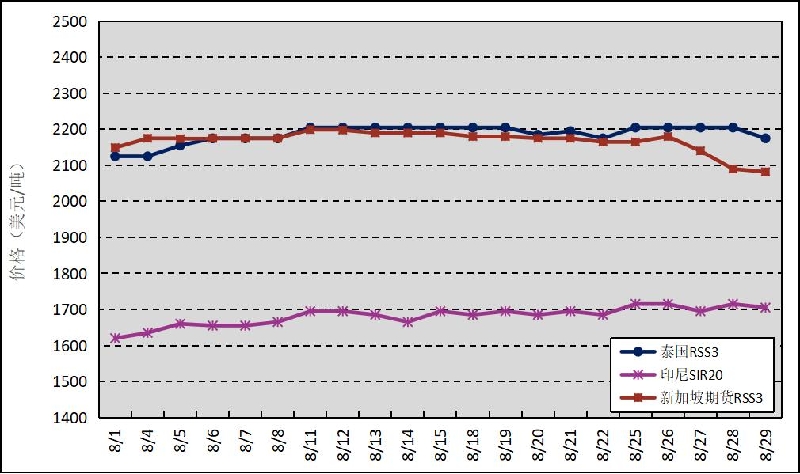 國外主產(chǎn)區(qū):8月,泰國RSS3平均價(jià)格為2186美元/噸,環(huán)比下跌59美元/噸,最高價(jià)為2205美元/噸,最低價(jià)為2125美元/噸;印尼SIR20平均價(jià)格為1682美元/噸,環(huán)比上漲24美元/噸,最高價(jià)為1715美元/噸,最低價(jià)為1620美元/噸;新加坡RSS3期貨主力合約月均結(jié)算價(jià)格為2168美元/噸,環(huán)比下跌87美元/噸,最高價(jià)為2199美元/噸,最低價(jià)為2082美元/噸。