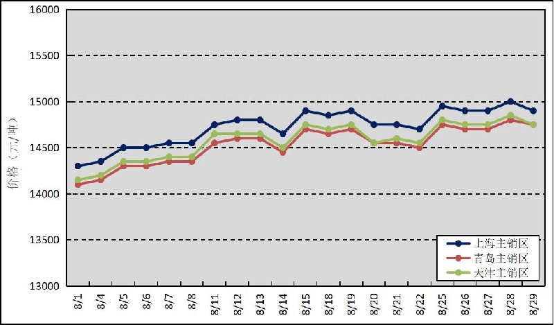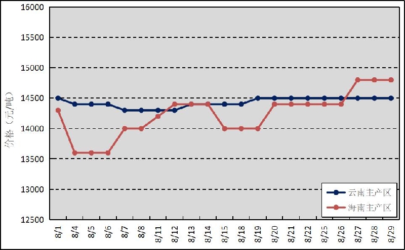 圖3 2025年8月國內(nèi)主銷區(qū)天然橡膠價(jià)格走勢(shì)