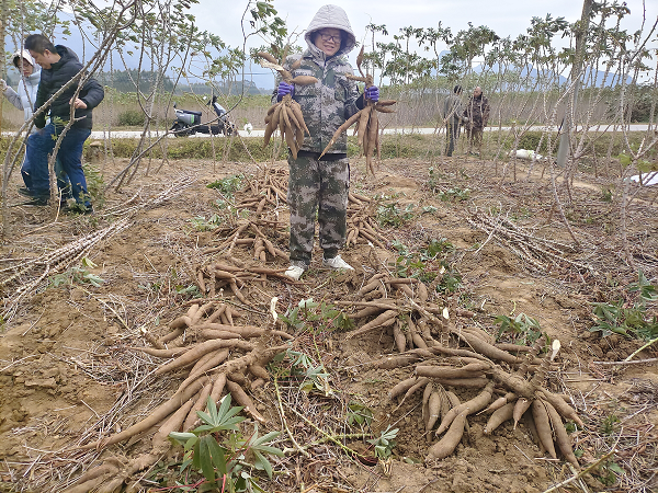 模式創(chuàng)新,凝聚發(fā)展之力。兩江鎮(zhèn)采用“專家+農戶”合作模式,引進國家木薯產業(yè)體系專家與農戶緊密合作,農戶提供土地,專家不定期到場提供技術支持,共同試驗種植高產新品種。今年,漢安村合作片區(qū)合作模式下的木薯種植基地面積達到了500畝,帶動周邊超100戶農戶參與,預計2025年種植面積將達3000畝以上。合作模式不僅突破了農戶種植技術的難關,也搭建起銷售的橋梁。新模式下,用新品種、新技術種植的木薯一上市便被搶購一空,收購價格比傳統(tǒng)種植模式下的木薯高出30%,帶動廣大農戶增收致富。